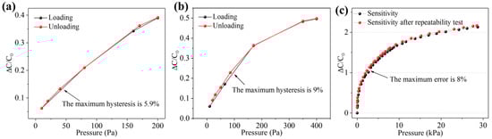 In the repeatability test with pressure 200 and 400 Pa, a loading–unloading process was carried out to explore the hysteresis of the sensor under dynamic pressure. As shown in Figure 10a,b, the hysteresis of the sensor under a dynamic pressure of 200 Pa was approximately 5.9% and that under a dynamic pressure of 400 Pa was approximately 9%. The sensor has suitably low hysteresis. To explore the sensitivity change of the sensor after a long-term operation, the sensitivity of the sensors under repeated loading–unloading cycles for a total of more than 10,000 times was tested and compared with the initial sensitivity (Figure 10c). The test results show that, after more than 10,000 pressure loading–unloading cycles, the sensitivity curve of the sensor basically fit the initial sensitivity curve, and the maximum error was approximately 8%. However, the sensitivity of the sensor after 10,000 repetitions was slightly higher than the initial sensitivity. This may be due to the performance abnormality caused by fatigue damage to the flexible material of the sensor under long-term loading.
