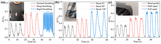 The multi-channel sensor signal acquisition system was used to realize the data acquisition of respiratory signals, elbow joint bending signals, and knee joint bending signals. The acquisition results are shown in Figure 12. Figure 12a shows that the sensor responds more accurately to the three breathing states, namely normal breathing, deep breathing, and rapid breathing. The intensity of deep breathing is greater than that of normal breathing, while the frequency of rapid breathing is higher. In addition, the intensity of inhalation during rapid breathing is similar to that of deep breathing, but the exhalation is not thorough enough. The real-time acquisition of the change in the sensor capacitance has a better mapping ability with the actual breathing situation. Figure 12b,c, respectively, show the capacitance response of the sensor to the bending state of the elbow joint and the knee joint. Between them, the elbow joint is a smaller joint, and the sensor has a larger bend when the elbow joint is bent, and thus can produce a larger change in capacitance. Because the knee joint is a larger joint, even if the knee joint is bent at a larger angle, owing to the small size of the sensor, its capacitance response is slightly lower than that when the elbow joint is bent. The test curve results also prove that the sensor can generate effective responses to different joint motion signals.