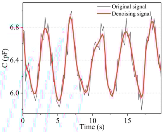As indicated by the black curve in Figure 14, the acquired signals inevitably comprise various noise signals because of the limitations of environment and experimental conditions during the signal acquisition process. Herein, to denoise the collected sensor signals, the wavelet threshold denoising method was adopted. The parameter setting rules of the wavelet threshold denoising method are as follows: the wavelet basis function is coif4, the number of wavelet decomposition layers is 5, the rigrsure threshold rule is used as the threshold method, and the soft threshold function is used as the threshold function. The data of different motion states collected by the sensor were transmitted to PC through Bluetooth for storage and denoising. The red curve in Figure 14 shows the denoising effect of partial breathing signals collected in the state of standing still. Clearly, the noise in the signals was successfully removed, and the signals after denoising had better smoothness and better retained the original change trend and characteristics of the signals.