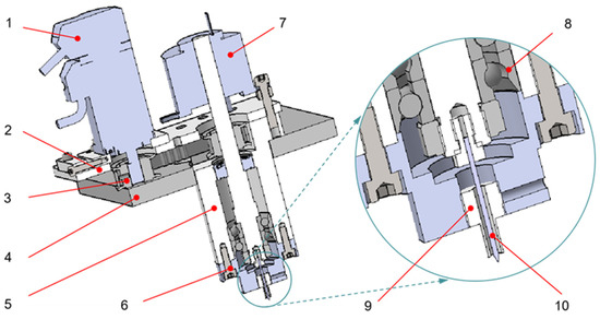 Structure diagram of integrated ER polishing tool system. (1) Driving motor, (2) Moving slide plate, (3) Synchronous pulley, (4) Support plate, (5) Outer sleeve, (6) Connection flange, (7) Conductive slip ring, (8) Deep groove ball bearing, (9) Annular electrode, (10) Tool needle.