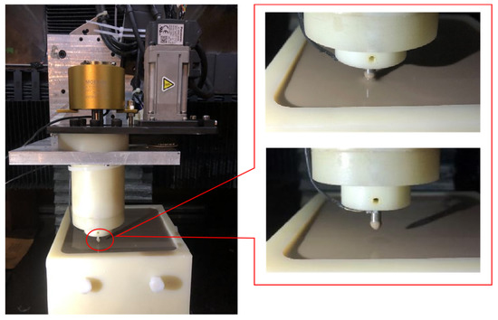 Figure 1 shows the structure of the self-made integrated ER polishing tool system. The tool system is composed of the motor, the support plate, the sliding plate, the synchronous pulley, the synchronous belt, the conductive slip ring, the outer sleeve, the deep groove ball bearing, the angular contact bearing, the tool shaft, the tool needle, the lock nut, the connecting flange and the annular electrode. Figure 2 shows the ER polishing equipment and the flexible polishing head due to ER effect.