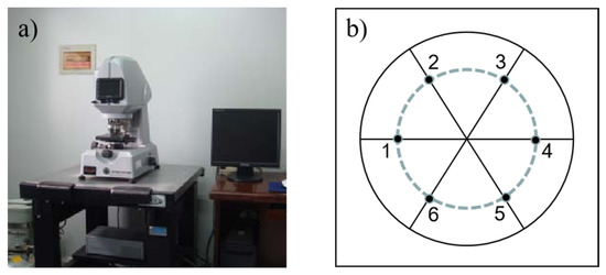In the experiments, aluminum is used as the workpiece. Before ER polishing, hand-held pneumatic polishing machines were used to pre-polish the surface of the workpiece, making the surface roughness reach 0.2μm. In both orthogonal experiments and single factor experiments, the polished area is a circle with a radius of 5 mm, and the recorded data is the average roughness of the six measuring points. The measurement of the roughness is carried out on the WYKO NT1100, as shown in Figure 3a. The distribution of the six-measuring points is shown in Figure 3b.