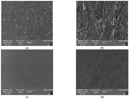 The ER polishing experiments are carried out in the best experimental combination, and the concentration of dispersed phase remains unchanged. The experimental results are shown in Figure 4. Figure 4a,b is an image enlarged by using tungsten filament scanning electron microscopy after pre-rough polishing, while Figure 4c,d is an image of surface after ER polishing. In Figure 4a,b, it can be found that there are some bumps on the workpiece surface, which are well improved in Figure 4c,d, indicating that the ER polishing has a good effect on removing the scratches and bumps on the workpiece surface. Although some small scratches can be observed on the polished surface, large scratches have been removed. Small scratches are caused by the abrasive particles that constantly rotate and hit the surface of the workpiece.
