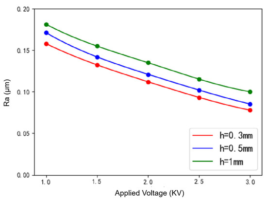 The variation of workpiece surface roughness with voltage under various polishing gaps is shown in Figure 5. As indicated by Figure 5, when the voltage increases two times from 1000 to 3000 V, the roughness decreases by 52.5% when h = 0.3 mm and 48.1% when h = 0.5 mm. When the applied voltage is low, the ER effect is weak, the “hardness” of the flexible polishing head is relatively low, and the polishing pressure on the workpiece is also not high enough. As a result, the phenomenon of material removal is not obvious. With the increase of the applied voltage, the ER effect is enhanced, and the bonding force between particles and the slurry viscosity increases. What is more, the abrasive aggregation effect is more obvious. That is to say, with the increase of the number of abrasives involved in polishing, the material removal ability of the polishing head is gradually enhanced, and the polishing effect is better.