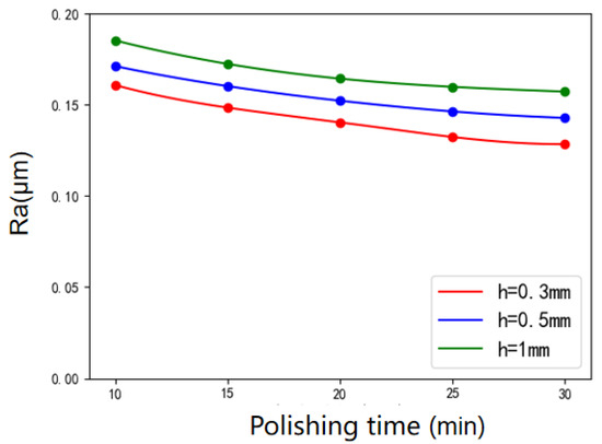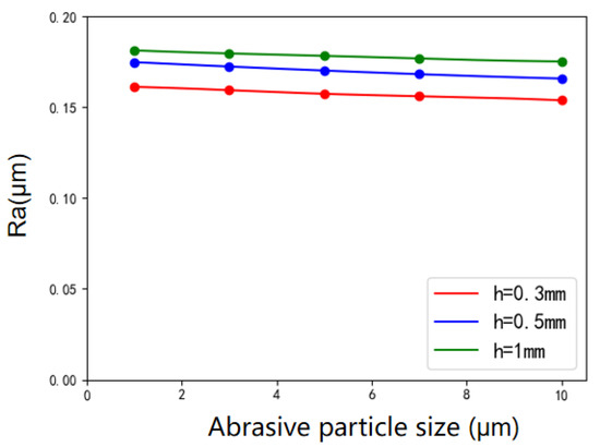 The variation trend of surface roughness with abrasive particle size is shown in Figure 6. It can be seen that when the size of the diamond abrasive gets larger, the surface roughness value decreases. When the size of the diamond abrasive increases from 1 to 10 µm, the roughness value decreases by 7.88% when h = 0.3 mm and 5.71% when h = 0.5 mm. The abrasive particles adhere to the chain of particles composed of dispersed particles, and the radius of the abrasive particles is much smaller than that of dispersed particles. Because the polishing tool head used in the experiment is small and the number of abrasive particles gathered at the end of the polishing tool head is limited, the actual effect of the abrasive particle size on the polishing is not obvious; thus, the variation of the surface roughness of the workpiece after polishing with different abrasive particle sizes does not change significantly.