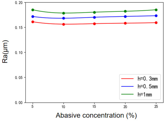 The variation trend of surface roughness with abrasive concentration under various polishing gaps is shown in Figure 7. When the abrasive concentration is about 10%, the surface roughness is the lowest, and the polishing effect is the best. However, the effect of abrasive concentration on surface roughness is not obvious generally. For a similar reason that the abrasive particle size has little effect on surface roughness, the polishing tool head used in the experiment is small, and the number of abrasive particles gathered at the end of the polishing tool head is also limited. Therefore, the improvement effect of abrasive concentration on surface roughness is not obvious.
