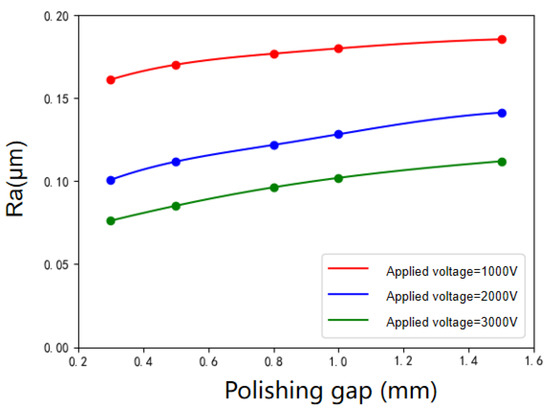 The variation of surface roughness of workpiece with polishing gaps under various applied voltages is shown in Figure 8. The polishing gap affects the electric field intensity in the polishing area, which directly affects the polishing effect of the workpiece surface. It can be seen that the surface roughness of the workpiece increases with the increase of the polishing gap. As the polishing gap increases fourfold from 0.3 to 1.5 mm, the surface roughness increases by 15.3% when the voltage is 1000 V and 42.5% when the voltage is 3000 V. The greater the distance from the end of the tool to the surface, the smaller the electric field intensity. The “hardness” of the polishing head formed by the ER effect is directly related to the electric field intensity. With the increase of the polishing gap, the “hardness” of the polishing head formed by the ER effect decreases gradually, and the material removal ability gets weaker. In addition, the larger the polishing gap is, the longer the chain which formed by the dispersed phase particles under the effect of the electric field is, and the arrangement is not as compact as that of the small gap. The abrasive particles cannot be attached to the chain better. During the process of tool spindle rotation, the abrasive particles may be far away from the polishing area, thus the material removal cannot be completed efficiently, and the surface roughness of the workpiece cannot be reduced.