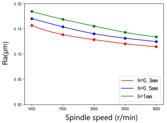 Figure 10 shows the variation of workpiece surface roughness with tool spindle speeds under various polishing gaps. It can be seen that with the increasing of tool spindle speed, the surface roughness value of the workpiece decreases. When the spindle speed increases from 1000 to 3000 rpm, the surface roughness decreases by 34.4% when h = 0.3 mm and 26.5% when h = 0.5 mm. According to the hydrodynamics, the relative velocity between the polishing tool and the workpiece surface will increase with the increase of the polishing tool spindle speed. According to Preston law, the material removal rate will also increase. Therefore, increasing the spindle speed can effectively improve the polishing efficiency.