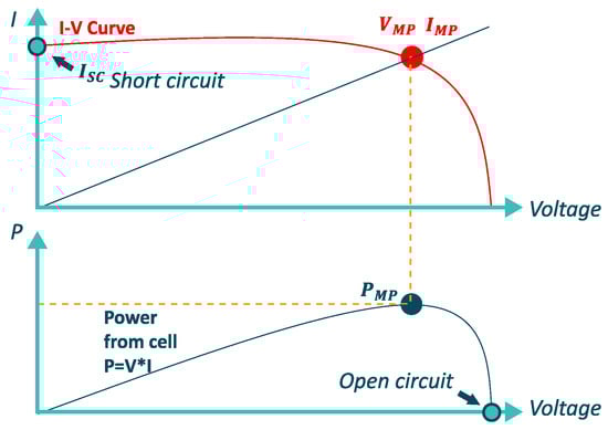 An I-V curve characterizes each PV panel or module, see Figure 3 where the maximum power conditions (I m p , V m p ) are explained. This curve, which is a standard, is available in the datasheet of each module or PV panel. It is calculated according to the standardized STC test, equal to the following conditions: (1000 W/m 2 , 25 °C, IAM 1.5) [56].