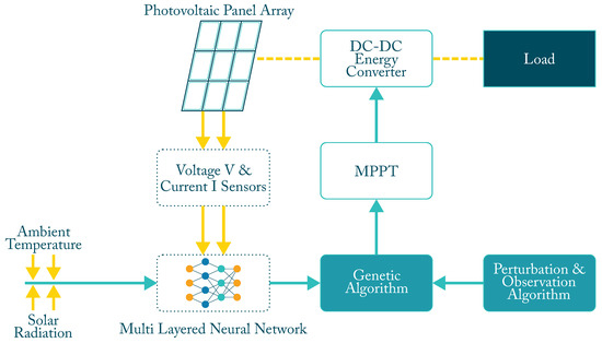 Hybrid intelligent systems (HIS) combine several of the algorithms or techniques shown above, either as part of a problem-solving method or to perform a specific task, to which may be added a third or fourth technique, a metaheuristic or optimization algorithm to improve ANN performance or improve input parameters. Figure 6 shows the general scheme of an MPPT controller using an ANN algorithm combined with GA to optimize the input and also combined with a traditional P&O algorithm to improve its performance. Additional selected characteristics are shown in Table 3.