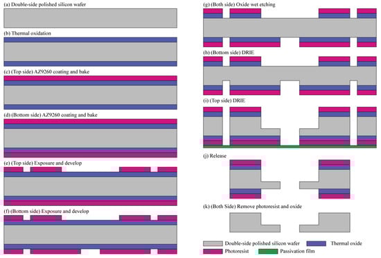 Figure 2f, for the photoresist-coated wafer, the pattern is defined first on the front side through the photolithography process, and then the pattern is formed on the opposite side using backside alignment equipment. Afterwards, the wet etching process was performed with the BOE solution to remove the oxide on the front and back of the wafer at the same time. In the DRIE process, the back side of the silicon substrate is etched to a depth of 300 µm following the photoresist pattern, and the front side of the wafer is also etched to a depth of 380 µm by attaching a passivation film on the back-side substrate to prevent helium leaking during the DIRE process, as shown in