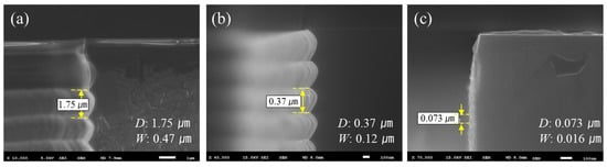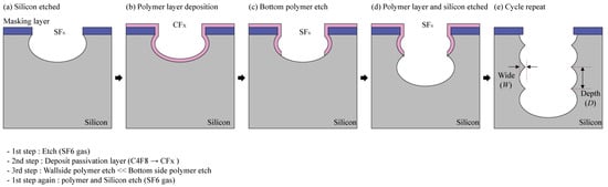 Figure 4 shows the concept of the Bosch process and the scalloping that occurs in the Bosch process. The Bosh process involves a repeating sequence of etching and passivation processes. These iterative processing methods necessarily result in the etching surface having a ribbed microstructure called a scallop and having different sizes depending on the process conditions. In this paper, to distinguish between the different sizes of these scallops, we defined it by measuring the vertical etching depth (D) and lateral etching width (W), as shown in