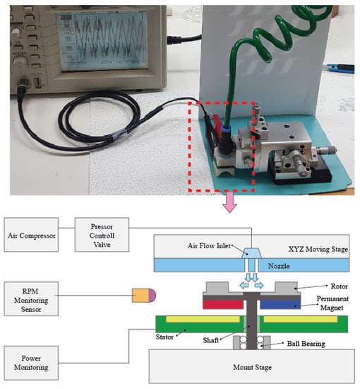 An air compressor was used to supply air to rotate the rotor, and an air regulator was used to control the supplied air flow. The nozzle was located at the top of the rotor so that air was supplied from the direction perpendicular to the rotor. In addition, the nozzle was installed on the xyz stage for precise distance adjustments with the rotor, allowing repeated experiments for different scallop sizes with the same gap. For the rotation test, the fabricated rotor was directly attached to the shaft and connected to the ball bearing, and then the rotor speed was measured using an infrared tachometer. In addition, the open circuit output voltage characteristics of the fabricated rotor combined with permanent magnets and a stator were measured to verify the power generation properties caused by rotation.