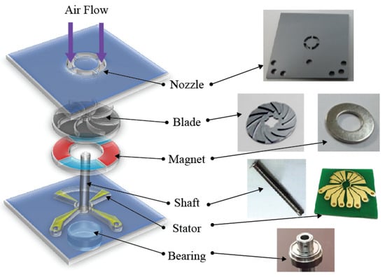 Figure 7 presents a schematic diagram of the components of the turbine constructed for the open circuit output voltage experiment of the fabricated rotor. A four-pole permanent magnet in the form of a disk was bonded to the back side of the fabricated rotor, and the shaft was attached to the rotor and mounted on the ball bearing, as shown in