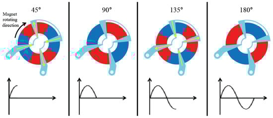 Figure 8 presents the principle diagram of an induced current experiment using the planar stator. When a donut-shaped permanent magnet rotates, an electric current is induced on a fixed stator. The proposed stator is not only flat but has three phases.