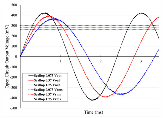 For the experiment, the same air pressure (20 psi) was supplied to the rotor and the generation characteristics were observed according to the scallop size. The results showed that the frequency of the output voltage increased because the rotary motion of the rotor increased as the scallop size decreased. Furthermore, the higher the frequency of Vrms, the higher the power of Vrms, which was judged to be a natural phenomenon of higher generation characteristics caused by higher rotational rates. In other words, the results of this experiment showed that a smooth surface caused by small scallop size increases the number of rotations of the rotor, resulting in an increased open circuit output voltage due to the increased number of rotations.