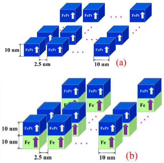 The model structures of the L10-FePt-based single-layer BPM and the L10-FePt/Fe bilayer ECC-BPM for an areal density of 4 Tb/in2 are shown in Figure 1a,b, respectively. The media configuration has been determined on the basis of BPM and ECC-BPM requirements. To achieve an areal density of 4 Tb/in2, the cube dot size of single-layer BPM of 10 × 10 × 10 nm3 and spacing between dots of 2.5 nm were assumed [12]. The bilayer ECC-BPM was introduced by magnetically adding a soft Fe layer with a 10 nm thickness under the FePt BPM. The Fe added layer was assumed to have the same dot pattern as the single-layer BPM. The magnetization of each layer was initially aligned along the +z direction for both media. The magnetic properties of the proposed media are detailed as follows: the L10-FePt hard layer had a saturation magnetization, Ms, of 1.175 MA/m, and a Ku of 2.8 MJ/m3. The Fe soft layer had Ms of 1.71 MA/m and Ku of 100 J/m3. For the bilayer media, the exchange coupling between soft and hard layers, Aex, was assumed to be 25 pJ/m, whereas the exchange coupling between magnetic dots, Adot, varied from 0.1 to 0.3 pJ/m. This variation of Adot was based on the possible values of the filled material between the dot spacing, as can be seen in the literature [21,22]. In calculations, the time-varying magnetization was described by the LLG equation, given as Equation (1) [23]: