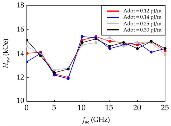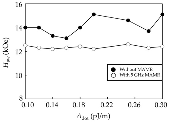 The Hsw of the proposed bilayer ECC-BPM at different Adot values was investigated at fac between 0 and 25 GHz, as shown in Figure 2. It was discovered that changing Adot or fac could change the Hsw. Without MAMR, the media with an Adot of 0.14 pJ/m have the lowest Hsw, followed by those with an Adot of 0.12, 0.25, and 0.30 pJ/m, respectively. A variation of Adot under the MAMR indicates a similar trend of Hsw for all fac. When the MAMR was performed, it revealed that increasing the fac from 0 to 2 GHz slightly changes the Hsw of the media. Then, the Hsw was dramatically reduced to the range of fac about 5–7.5 GHz. Above fac of 10 GHz, the Hsw of all media tended to have a higher Hsw than that without MAMR and was insignificantly changed with varying fac. From the results, the media with Adot = 0.25, 0.30 pJ/m indicate their lowest Hsw at a fac of 5 GHz, whereas the lowest Hsw of media with Adot = 0.12, 0.14 pJ/m occurs at a fac of 7.5 GHz. The lowest Hsw found in this evaluation is 11.9 kOe, achieved by the media with an Adot of 0.14 pJ/m with MAMR at a fac of 7.5 GHz. However, since the resonance frequency of our proposed system is 5 GHz, we therefore examined more details of Adot’s influence on the Hsw at this frequency.