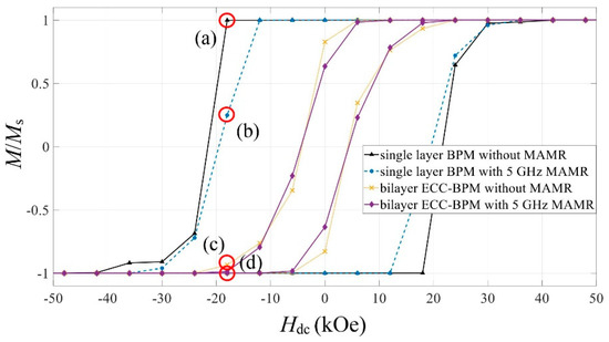 A comparison of the hysteresis loops of the single-layer BPM and the bilayer ECC-BPM for cases without and with 5 GHz MAMR is indicated in Figure 4. The Adot of 0.14 pJ/m was selected for this characterization for both media since this value previously demonstrates the lowest Hsw under MAMR. In this figure, the Hsw is determined at the point that M = −0.8Ms. From the results, the single-layer BPM has the Hsw of 27 kOe and 26 kOe for cases without and with MAMR, respectively. By adding the Fe soft layer to the single-layer BPM, the Hsw of the bilayer ECC-BPM for the cases without and with MAMR was reduced to 13.3 kOe and 12.2 kOe, respectively, which are significantly lower than that of the single-layer BPM. To provide more information about the magnetization orientation of the media, the magnetic domain of four media was characterized at the points where Hdc = −18 kOe since this particular Hdc can indicate the difference between them. Figure 5a,d show the magnetic domain from the cross-sectional side view of media at the points shown by circles (a–d) in Figure 4, respectively. It is seen that the magnetization of the single-layer BPM with MAMR contains more reversed magnetization than that without MAMR, demonstrating the effects of MAMR assisting the magnetization switching. Additionally, the magnetization of the bilayer ECC-BPMs is greatly reversed when compared to the single-layer BPM. The use of the MAMR in the bilayer ECC-BPM indicates a slightly better reversal of magnetization.