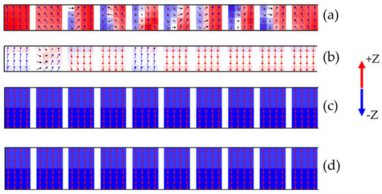 Magnetic domain from cross-sectional side view of (a) Single-layer BPM; (b) Single-layer BPM with MAMR; (c) Bilayer ECC-BPM; (d) Bilayer ECC-BPM with MAMR at Hdc = −18 kOe.