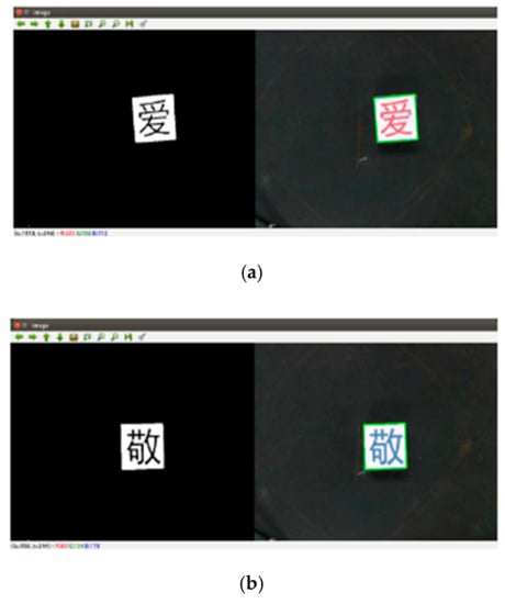 Actual recognition results of object detection. (a) Recognition result of Chinese character wooden block “ai”; (b) Recognition result of Chinese character wooden block “jing”; (c) Recognition result of Chinese character wooden block “cheng”; and (d) Recognition result of Chinese character wooden block “you”.