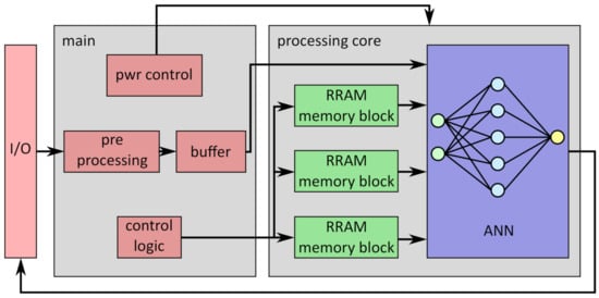 The digital architecture consists of several hardware blocks, each of which represents a layer of the ANN. Each block uses simple processing elements that perform arithmetic operations (mainly multiplication and addition). The required parameters are directly routed in parallel from the RRAM memory blocks to the processing elements. Thus, all parameters need to be read in parallel. The processing core can be switched off by the main core in order to save energy. If enough input data are preprocessed and buffered, the processing core can be switched on; the weights and bias values stored in the RRAM blocks are then loaded and the buffered data can be processed by the ANN. After loading the values from the RRAM memory, the memory blocks themselves can be put to sleep again during the inference of the ANN. Thereafter, the processing core can be switched off again to save energy, until enough data are buffered for the next batch. By using this technique, over 90% of the energy can be saved compared to an always-on processing core [].