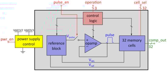 Block diagram of the memory block. The digital inputs are marked in red, the outputs in green and the internal analog signals in blue. A logic block sets several control signals for the operational amplifier (opamp), the memory cells, and the reference block. The power supply control connects or disconnects the whole memory block from the supply rails according to the power enable signal pwr_en.