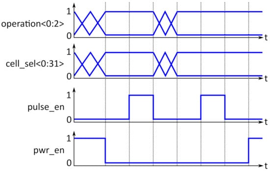 System waveforms: the operation<0:2> bits determine the voltage levels, while the cell_sel<0:31> signals activate the cells to interact with. The pulse_en signal triggers the operation, while pwr_en is used to switch the memory block on and off.