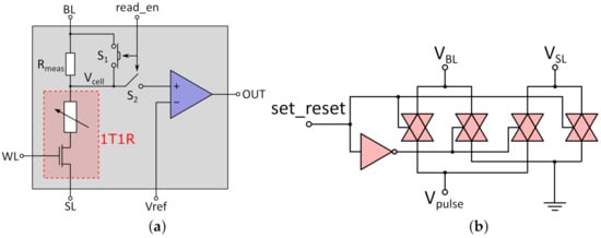 During a write operation, the read_en signal is low, closing switch S1 and opening S2 in Figure 4b. This disconnects the comparator from the RRAM cell and bypasses the measurement resistor Rmeas to prevent any write disturbance. The applied voltage pulses and WL voltages for programming the respective states are shown in Table 1. In order to reset the cells from each LRS to HRS, the voltage pulse has to be applied to the SL while the BL is grounded in order to realize current flow through the MIM stack in the opposite direction. This will rupture the conductive filament inside the MIM stack, therefore increasing the cell resistance. The polarity of the pulse is determined by the set_reset signal, which controls the set_reset switch shown in Figure 4. The set_reset switch consists of four transmission gates that connect the BL or SL to ground and the other is connected through to the Vpulse terminal. The VBL and VSL terminals are connected to the respective terminals of the memory cell, and the voltage pulse is applied to the Vpulse terminal. Therefore, the bidirectional current flow for the reset process can be realized without the need to provide negative voltages on-chip and can be controlled by one single-digital signal. During read operations, the control signal should just be on set, since pulse polarity for set and read processes is identical.