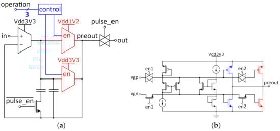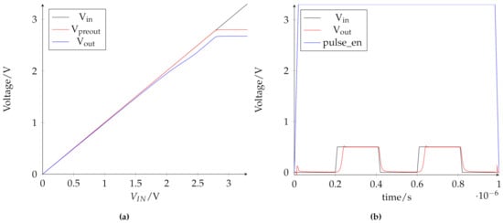 Figure 7a shows a DC sweep of the input voltage for the operational amplifier. The input voltage Vin, shown in black, is applied to the positive input of the amplifier, while the negative input is connected to the output. Therefore, the amplifier is in voltage-follower configuration and always wants to replicate the input voltage at its output. The labeling of the voltages follows the description in Figure 5a. During this simulation, the output stage is active. The load of the amplifier at the output for this simulation is a resistance of 350 . This value was chosen as a worst-case estimation if all 32 RRAM cells of the memory block are selected and in LRS2. The value is calculated according to Table 2 with 32 times in parallel and lowered by 15% to account for cell variance.