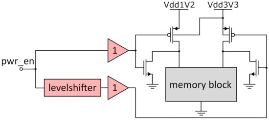 In order to decrease the overall power consumption significantly, it is implemented such that the memory block can be disconnected from the voltage supply. This is controlled by the pwr_en signal. This signal is low-active and connects or disconnects the circuit blocks from the voltage supply lines by switching off PMOS pass transistors between the circuit and the supply rails. Figure 6 shows the concept of the power control. The memory block is always connected to ground. If pwr_en is low, the memory block is disconnected from the supply rails but connected to the ground in order to define the voltages in the memory block during power-down cycles and prevent floating potentials. The pwr_en signal must be shifted to switch the transistor and is buffered to ensure a defined signal strength. To reduce the leakage current during power-off, the n-well of the transistor is connected to . This results in an increased body effect that raises the threshold voltage, therefore reducing the leakage current during off cycles. The channel length of the pass transistors should not be the minimal length in order to reduce the leakage current even further. To prevent a significant voltage drop over the transistors, which would lower the supply voltage, when high current is flowing into the memory block, the pass transistors should be designed with wide channel width.