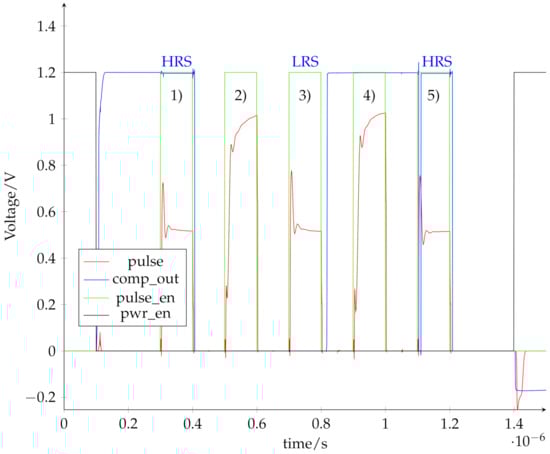 Figure 8 shows the transient simulation results for a programming and read sequence with the whole memory block. The nomenclature of the signals is taken from Figure 2. The pwr_en signal (yellow) connects the memory block to the voltage supply. The pulse_en signals (green) marks the voltage pulses while the pulse signal (red) shows the voltage at the output of the amplifier, which is directly applied to the RRAM cells. As a pulse width, 100 were chosen. The simulation sequence contains the following operations, marked in Figure 8: