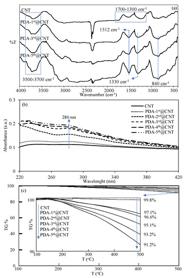 The FT-IR spectra of CNT and PDA-coated PDA-1st@CNT, PDA-3rd@CNT, and PDA-5th@CNT were also compared in Figure 2a to confirm the success of the coating process of CNTs. It was clearly seen from the FT-IR spectra of the CNTs that the peaks in the 3700–3500 cm−1 range are due to the O-H vibrations from amorphous carbon, and the peaks between 1700 and 1300 cm−1 belong to the C=C skeleton stretching, C-C vibrations, and C-O stretching vibrations, respectively [54,55]. However, there are some distinct changes observed in the FT-IR spectrum of CNT after PDA coatings, which are the N-H bending at 1512 cm−1, O-H bending at 1330 cm−1, and C=C peaks at 840 cm−1, respectively [10]. Moreover, the UV-Vis spectra of bare CNT and PDA-coated CNTs were also recorded in 220–420 nm wavelength ranges to observe the characteristic absorbance of PDA, around 280 nm [43,56], and they are compared in Figure 2b after every coating.