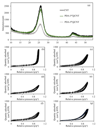 (a) XRD pattern of CNT and PDA@CNTs and the N2 adsorption/desorption curves of (b) CNT, (c) PDA-1st@CNT, (d) PDA-2nd@CNT, (e) PDA-3rd@CNT, (f) PDA-4th@CNT, and (g) PDA-5th@CNT.