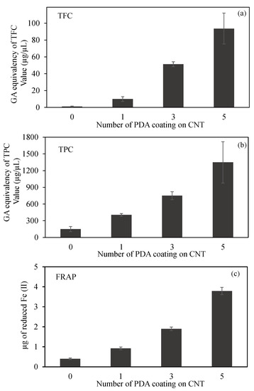 Antioxidant capacities of bare CNT, PDA-1st@CNT, PDA-3rd@CNT, and PDA-5th@CNT were determined via three different antioxidant assays such as the total phenol content (TPC), total flavonoid content (TFC), and ferric-reducing antioxidant power (FRAP) in accord with the literature [47]. The sample solutions in water at 2 mg/mL concentrations were prepared for TFC and TPC tests, and pH 3.6 acetate buffer was used for the FRAP test. Before starting all the tests, the samples were suspended in solutions and were sonicated at room temperature for 10 min.