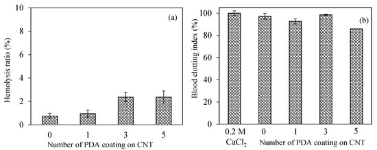 Fresh blood, 4 mL was diluted with 5 mL of 0.9% NaCl aqueous solution for the hemolysis procedure. Separately, 5 mg of CNT, PDA-1st@CNT, PDA-3rd@CNT, and PDA-5th@CNT were put in tubes containing 10 mL of 0.9% NaCl solution (final concentration is 0.5 mg/mL). Then, 200 μL of diluted blood was gently injected to these tubes to enable the blood to make contact with the CNT, PDA-1st@CNT, PDA-3rd@CNT, and PDA-5th@CNTs. After 1 h of incubation at 37 °C, the CNTs/PDA@CNTs–blood solution was centrifuged at 100 g for 5 min to separate undamaged erythrocytes. To determine the hemolysis ratio of materials, the absorbance of supernatant was measured using UV-Vis spectroscopy (T80+UV/Vis spectrometer, PG Instrument Ltd., Leicestershire, UK) at 542 nm. All experiments were carried out in three repetitions. DI water and 0.9% NaCl solution were used as positive and negative control groups, respectively, and the hemolysis ratio percentage was calculated using Equation (1).