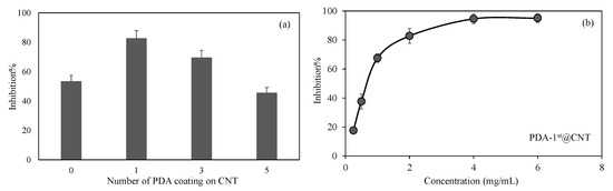 In Figure 6a, the inhibitory effect of CNT, PDA-1st@CNT, PDA-3rd@CNT, and PDA-5th@CNT solution at 2 mg/mL concentration on the activity of alpha-glucosidase enzyme was given. It was observed that the alpha-glucosidase enzyme activity was inhibited via bare CNT at 2 mg/mL concentration with 53.5 ± 3.9% inhibition. On the other hand, for the same concentrations of PDA-1st@CNT, PDA-3rd@CNT, and PDA-5th@CNT solution, the enzyme inhibitions were determined as 82.8 ± 5.1%, 69.6 ± 4.8%, and 45.6 ± 3.6%, respectively. The higher enzyme inhibition was observed for PDA-1st@CNT. It is understood from these results that there is a cumulative effect of CNT and dopamine together in the first coating. However, as the number of coatings increases, the effect of enzyme inhibition decreases. This situation may be due to two reasons. Firstly, it is possible that CNTs’ inhibition properties are masked with the presence of the first layer of PDA, and as the number of PDA layers is increased, the PDA’s ability to inhibit the enzyme is decreased. Secondly, with the higher number of PDA coatings on CNT, the aggregation through the increased number of coatings is possible, which leads to less interactions with the enzyme, hence leading to the decrease in overall inhibition percentage with respect to the 1st and 3rd coatings.