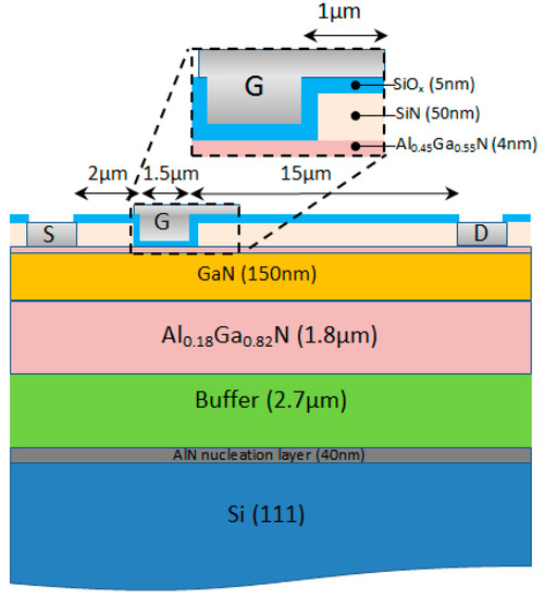 Normal ON AIGaN/GaN MOS-HEMT devices were realized on commercial HEMT substrate. The composition of the transistor includes: a highly resistive Si substrate, an AlGaN buffer with a back barrier grown on 40 nm of an AlN nucleation layer, a 150 nm GaN non-intentionally doped channel, a 4 nm Al0.45Ga0.55N barrier and 5 nm SiO2 gate oxide. The transistors have the following dimensions: a gate length of 1.5 µm, 1 µm gamma field plate, a source-drain distance (LGS) of 2 µm, and 15 µm gate-drain (LGD) distance. The epitaxial structure used for this study is illustrated in Figure 1.