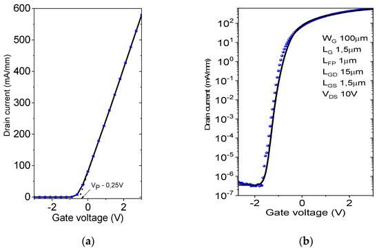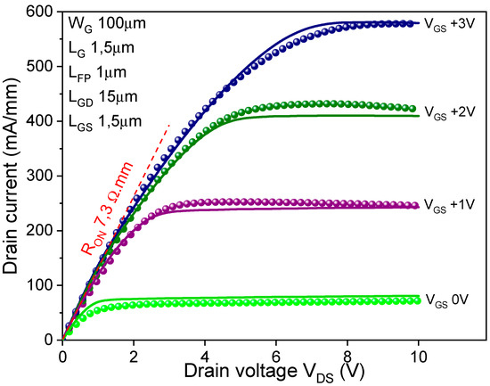 First of all, DC measurements were performed on the devices before measuring the breakdown voltage. Simulations were then calibrated against experimental transfer and output IV curves. The maximum IDS was more than 570 mA/mm at VGS value of 3 V. The devices exhibited a pinch-off voltage of −0.25 V with a leakage current below 1010 A/mm. Drain current density (IDS) versus drain-to-source voltage (VDS) characteristics at a gate-to-source voltage (VGS) from 0 to +3 V of “fresh” device are shown in Figure 2. As shown in Figure 2, the device demonstrates an on-state resistance (RON) of 7.3 Ω·mm. We notice that we did not observe the kink effect in the elaborated device in the measured range (VDS 0–10 V), meaning that the electronic surface states near the top active areas are not predominant in our MOS-HEMT. The outcomes of the experimental and simulated transfer curves are shown in Figure 3. Applying the parameters specified above, a good fit is obtained.