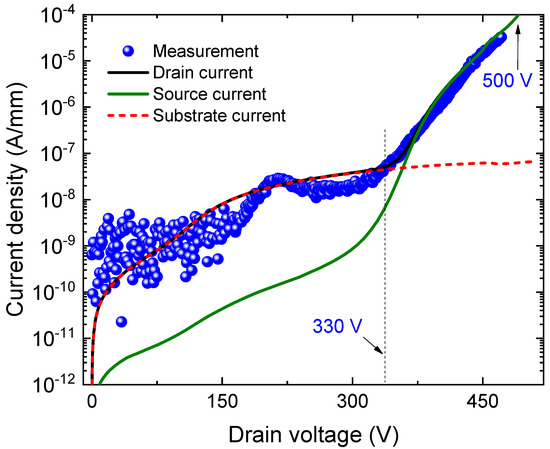 Three terminals measurements under pinch off conditions (VGS = −8 V, Vsubstrate = 0 V) were carryout. The breakdown voltage was about 500 V, as shown in Figure 4. At a low drain voltage below 330 V, the substrate current dominated the drain current. It is verified that the gate current was not the trigger of the device breakdown. The rapid increase of the gate current was not observed at the breakdown. On the other hand, at high drain voltage over 330 V, the drain current increases rapidly and simultaneously with the source current. The substrate current remains at same level. The first stage of breakdown occurred with the increase of the drain and source currents at 400 V. Therefore, the source-to-drain leakage current (IDS) is considered to be the breakdown trigger.