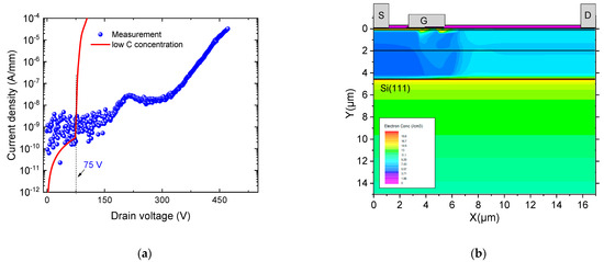 Figure 5. MOS-HEMT breakdown characteristics (a) Experimental (doted) and simulated (line) with low carbon concentration. Acceptor trap concentration of and 7.5 × 1014 cm−3 and donor trap concentration of 3.37 × 1014 cm−3 were considered. (b) MOS-HEMT structure cross section of electrons concentration at 100V showing more leakage across the buffer.