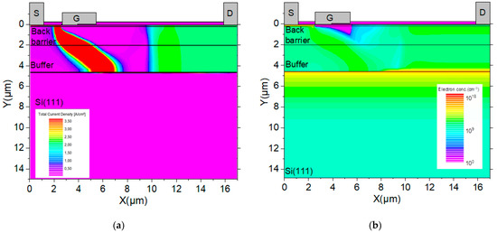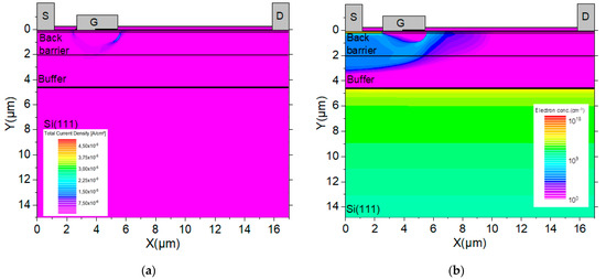 Figure 8. MOS-HEMT structure cross section of (a) current density and (b) electrons concentration at 500 V showing no current path through the 2DEG at AlN/Si interface. A small leakage current 10−14 A/mm through the buffer is denoted.