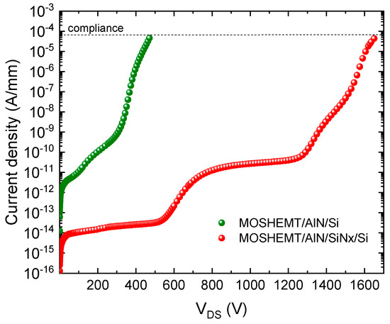The breakdown voltage in the off state accrues around 1500 V, which is three times greater than the device without 3 nm SiNx layer. Drain current versus drain voltage for the MOS-HEMT structure with and without the SiNx interlayer is represented in Figure 9.
