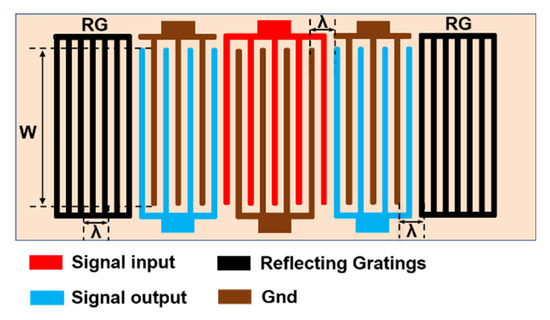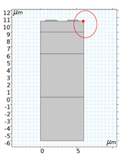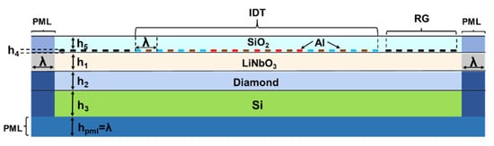 FEM simulation is an essential step in the design and fabrication of SAW devices. The device simulation can not only improve design accuracy, but it can also reduce unnecessary material losses. In this article, the software used for FEM analysis is COMSOL Multiphysics 5.6, which can easily perform piezoelectric coupling analysis and is used to analyze the response of 2D or 3D structural devices to changes in voltage and mechanical load. Thus, this software is suitable for the analysis and simulation of SAW devices. The simulation results can be used as the reference for the design and optimization of future SAW devices [11]. Because the interdigital electrodes of the IDT are periodically distributed, which reduces the simulation time, a simulation model can be established through one cycle. Considering that the Rayleigh wave and its higher-order mode vibrations are mainly limited to one wavelength (λ) on the surface, a 2D unit model with a substrate thickness greater than 1.5λ was established, as shown in Figure 3.