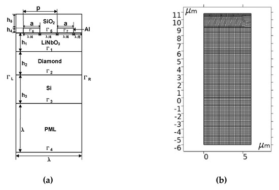 In Figure 3a, p is the distance between two adjacent metal electrodes; a is the width of the metal electrode; and , , , , and indicate the thicknesses of the lithium niobate, diamond, silicon, metal, and SiO2 layers, respectively. To eliminate the influence of the metallization rate and obtain the maximum reflectivity of the reflector, the metallization rate (MR = a/p) was designed to be 0.5. After the metallization rate was determined, because the propagation characteristics of the layered SAW structure are independent of the wavelength, the SAW wavelength was designed to be λ = 6 μm. Because most of the energy of the SAW is confined to the surface, and the thicknesses and are excluded, it was set to a fixed value while , , and were designed as variables. An aluminum electrode with a wavelength of 6 μm was deposited on the LiNbO3 surface. Silicon is assumed to be a semi-infinite substrate. The film thickness ratios and had ten values in the range of 0.1 to 1 with the interval of 0.1, and had five values in the range of 0.1 to 0.5, with the interval of 0.1. A perfectly matched layer (PML) can absorb propagating waves, accelerate the attenuation of evanescent waves, and perfectly match arbitrary lossy media [12]; therefore, a PML of 1λ was set in this study. In COMSOL, the model needs to be meshed. As shown in Figure 3b, to ensure calculation accuracy, we divided the minimum free quadrilateral unit, the smallest unit being 1.26 nm. For the IDT structure, NG, NIN, and NOUT indicate the number of reflective gratings, input fork index, and output fork index, respectively. The specific geometric parameters involved are shown in Table 1.