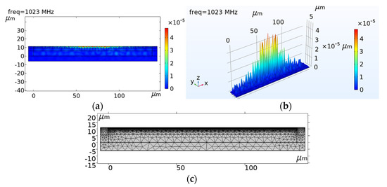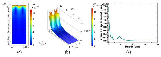 The finite element analysis of the SiO2/IDT/LiNbO3/diamond/Si layered unit structure was carried out with COMSOL Multiphysics software, and the COMSOL Multiphysics model used in this work was built in 2D Structural Mechanics Module, with emphasis on the analysis of its resonance mode and frequency response. Through the modal analysis, symmetrical modes and antisymmetric modes can be obtained, and the occurrence of their resonant frequency and anti-resonant frequency is caused by the effect of metal electrode [21]. Plots of the longitudinal displacement versus substrate depth are shown in Figure 4a,b. The results indicate that the more it approaches the surface, the greater the vibration energy of the SAW, and the more obvious the vibration. Figure 4c clearly shows that the vibration intensity decreases exponentially as the depth of the substrate increases. It can be seen that most of the vibration energy during Rayleigh waves propagation on the substrate is within one wavelength, which is consistent with the research in the literature [22]. The results demonstrate the reliability of the model.