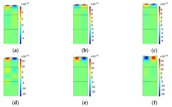 The acoustic wave modes shapes and their X-component of displacement (). (a–c) Anti-resonance of Rayleigh mode. (d–f) Anti-Resonance of Sezawa mode. (a,d) When . (b,e) When and (c,f) when .