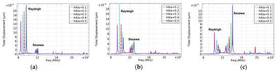 As shown in Figure 6a, as the electrode thickness decreases, the resonance frequency and displacement of the Rayleigh and Sezawa waves gradually increase, and the electrode mass loading effect is apparent. When , that is, , the resonance frequency and displacement reach their maximum values. In other cases, the resonance displacement in the Rayleigh wave decays as the electrode thickness decreases, as shown in Figure 6b,c. In contrast, as the thickness of the piezoelectric layer decreases, the influence of the electrode thickness on the Sezawa wave increases, and the Sezawa mode shows strict regularity. The variation rules of the results in Figure 7 are consistent with those in Figure 6. In either case, the resonance frequency decayed with an increase in the electrode thickness. There are other types of waves in the high-frequency range, but they were not considered in this study because of their small influence.