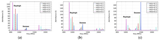 When the electrode thickness is zero or very small, the resonant and anti-resonant frequencies are basically the same, but with an increase in the electrode thickness, the Rayleigh wave acoustic field begins to move to the surface of the piezoelectric layer; the resonant and anti-resonant frequencies become significantly different and, according to Formula (7), correlate with the corresponding . Simultaneously, the acoustic field of the Sezawa wave is mainly distributed at the interface between the piezoelectric film and the substrate; therefore, the mass loading effect of the electrode has a limited contribution to the velocity of the Sezawa wave. As the electrode thickness increased, the sound field began to move toward the surface of the piezoelectric layer. In this process, the distributions of the sound field and the electric field begin to match, and when the electrode thickness reaches a certain value, can reach the maximum value. As the thickness of the electrode continued to increase, the acoustic energy began to concentrate inside the electrode. At this time, the acoustic and electric fields begin to mismatch, and the coupling coefficient begins to decrease. Comparing the results presented in Figure 6, Figure 7 and Figure 9, when = 0.1, it can be observed that these SAWs have the highest sound velocity, a good coupling coefficient, and significant admittance characteristics. Therefore, this electrode parameter was used in the subsequent studies.