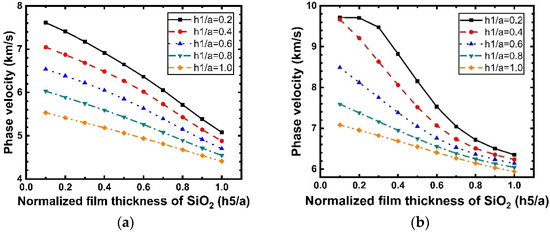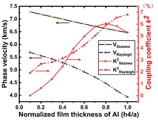 As shown in Figure 9, the phase velocities decrease with the increasing electrode thickness for all wave modes. The phase velocity changes from 5686 to 3994 m/s for Rayleigh and from 7277 m/s to 6484 m/s for Sezawa. This indicates that the phase velocity of the Rayleigh wave decreases rapidly with an increase in the electrode thickness, whereas the phase velocity of the Sezawa wave is less affected by the electrode thickness. Moreover, this difference confirms that Rayleigh waves are concentrated on the surface of the piezoelectric thin film. In addition, it is clear that both the Rayleigh and Sezawa modes have a large value, exhibiting an upward trend for both. A high value (greater than 5.75%) was obtained for Sezawa in the range of 0.5–0.8, and the value peaked at = 0.8.